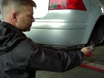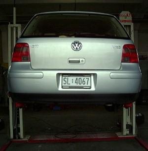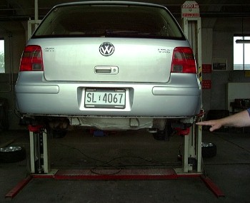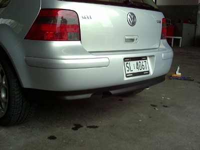 Golf IV rear 4-Motion V6 lower spoilerTools needed T25 torx screwdriver, angle cutter, Torque wrench, 17mm socket, High temp paint, medium half round file, 10mm nut. 1) begining, raise car up and remove rear wheels. 2) Remove T25 Torx head screws on each end of rear lower