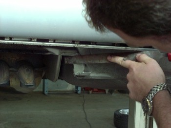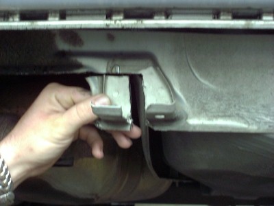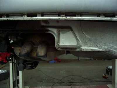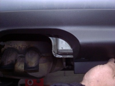 pry out spoiler, it comes off fairly easy. 3) Spoiler removed 4) Exhaust area needing a bigger opening 5) Check area to be removed by fitting new 4-motion